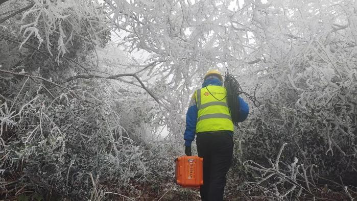 隘门界山高坡陡、海拔较高,持续低温让山路结上厚冰,抢修车辆行至山脚无法继续前行。为抢抓抢修黄金时间,抢修人员毅然决定徒步登山,经过近一个小时的艰难攀爬,终于抵达山顶故障区域。