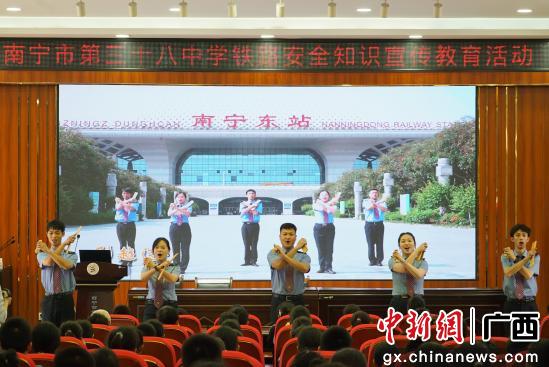 中新网广西新闻5月26日电(宋彤波)“车速快,真稀奇,翻越护网去嬉戏,罚款检讨是打底,情节严重要拘役……”5月23日上午,南宁市第三十八中大礼堂里快板声清脆,掌声如潮。中国铁路南宁局集团有限公司南宁工务段等单位联合开展“5·26我爱路”主题宣传教育活动。