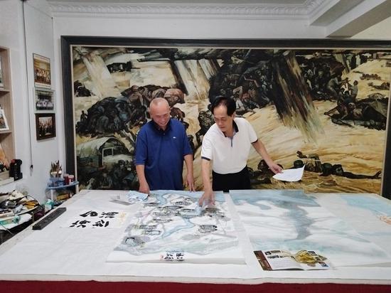 陈中华(右)和张兴动在沟通绘画细节。被访者供图。
