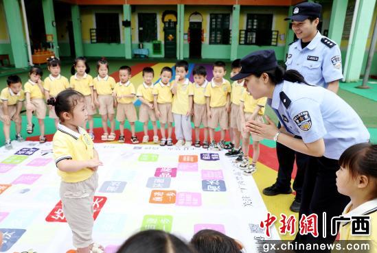 图为民警辅警引导小朋友玩游戏并进行禁毒知识互动。甘勇 摄