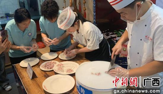 在鱼生馆传承人的引领下,同学们近距离观摩了横县鱼生制作全过程。传承人展示的“蝉翼刀工”令在场师生叹为观止。同学们还体验切片、摆盘等工序,深刻体会传统技艺的精湛,激发了对非遗传承的浓厚热情和强烈责任感。