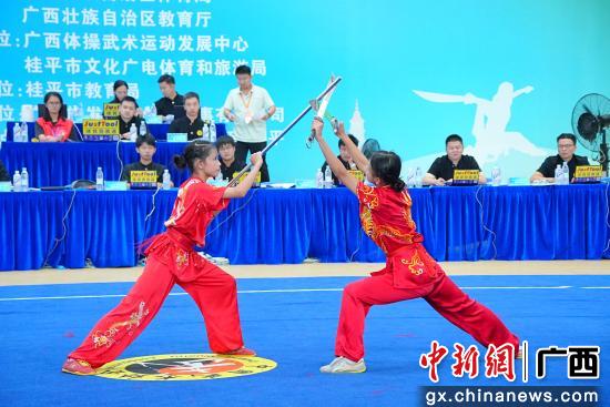 中新网广西新闻8月21日电(刘政 肖婷)近日,“中国体育彩票杯”2025年广西少年儿童武术套路锦标赛在桂平市第五中学竞技馆内落下帷幕。运动员齐聚一堂,施展刀枪棍剑拳术等十八般武艺,以武会友,以武传情,共同演绎了一场精彩绝伦的武术盛宴。