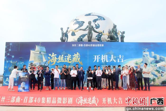 中新网广西新闻3月21日电(翟李强)3月20日,由中共北海市委宣传部、北海市旅游文体局指导,魅力华夏研学实践影视基地(广西)有限公司、北海银盛微剧影视城有限公司等机构共同打造的微影剧《海丝迷藏》开机仪式,在北海银滩“潮”雕广场举行。