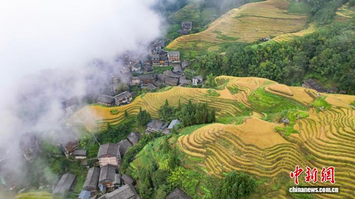 10月24日,在广西三江侗族自治县林溪镇程阳八寨景区,金黄稻田、古朴侗寨、蜿蜒河水与村民田间劳作的忙碌身影相映成趣,绘就一幅诗意盎然的金秋画卷。……