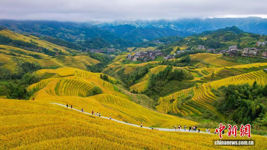10月25日,广西柳城县古砦仫佬族乡,游客在金色的稻田中游玩。当日,当地举办生态文化旅游节,展现独特民族风情与乡村丰收画卷。……