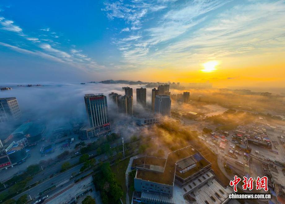 12月30日,广西梧州市城区上空呈现梦幻云雾景观。因近期昼夜温差加大,广西梧州城区上空水汽凝结,层层云雾缭绕山间楼宇,民居在云海中若隐若现,宛如水墨画卷。……