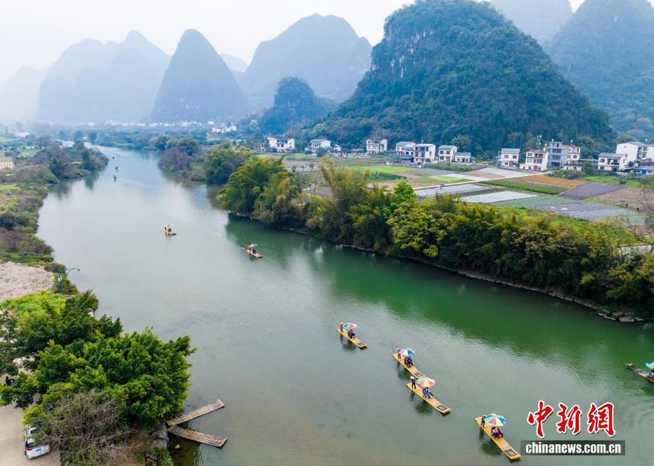 眼下,广西桂林阳朔遇龙河景区迎来春游热潮,游客乘竹筏穿行于山水之间,乐享春日美景。……