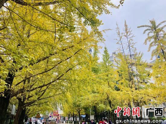 中新网广西新闻12月9日电(王亚东)近日,广西桂林市七星区猫儿山社区的一大片银杏树正悄然由翠绿渐变为金黄。一排排银杏树也成为桂林市秋冬季的“网红”,随风飘落的银杏叶十分浪漫,吸引许多市民前来赏景拍照。