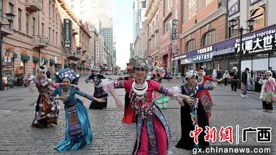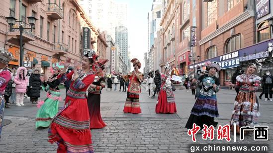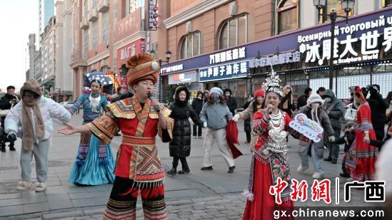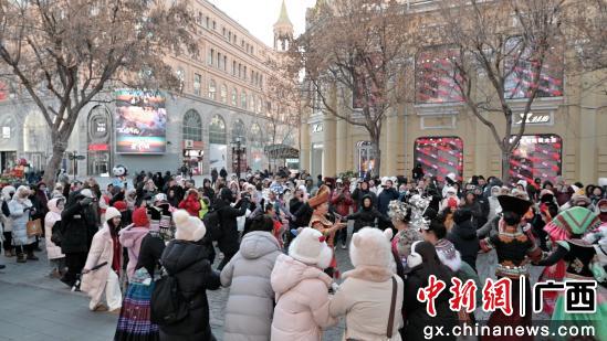 12月17日,在黑龙江哈尔滨中央大街,来自广西的演员穿着民族盛装,邀请“东北老铁”共跳连心舞。当天,演员们还表演了广西“科目三”,动感的BGM(背景音乐)、不羁的舞步、强烈的节奏……吸引民众围观。此次“快闪”活动旨在宣传广西文旅,以最接地气的方式,让黑龙江朋友了解广西。活动还向“东北老铁”发出“冬游广西”的盛情邀约。