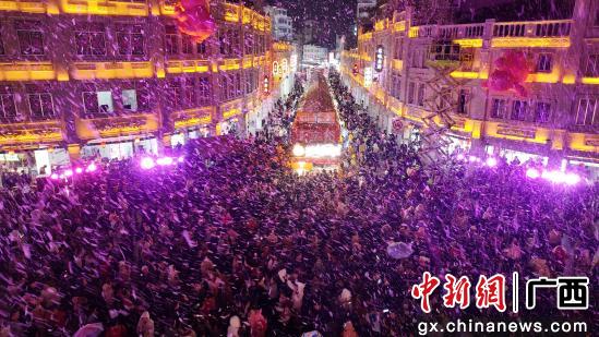 中新网广西新闻1月3日电(覃小原)2024年12月31日,广西玉林十字街以“睇睇新年雪,年年行大运”为主题,将传统的好意头与现代创意完美融合,打造了一场别开生面的跨年庆典。当晚,十字街早早就汇聚了前来共同见证跨年时刻的市民和游客,现场人声鼎沸,翘首以盼新一年的到来。