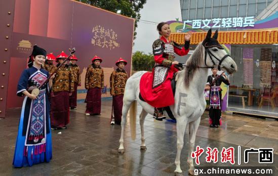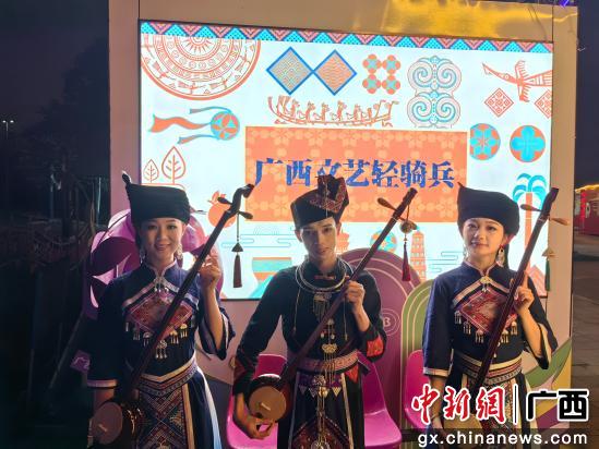 活动中,广西的壮锦、绣球等具有浓郁特色的展品吸引了来宾们的目光,他们纷纷驻足欣赏。随后,广西文艺轻骑兵的天琴演奏者李恩平,携两位女演员带来精彩的天琴弹唱跳表演。