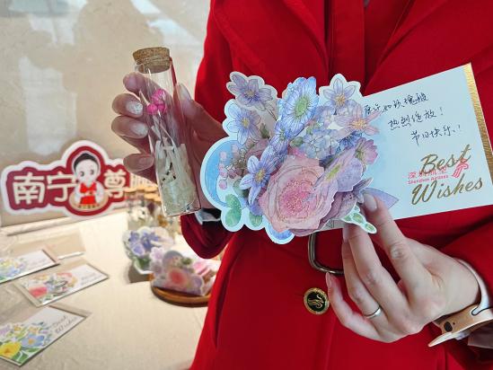 当日,位于南宁吴圩机场的深航南宁尊鹏阁休息室里,以“臻情相邕,温暖启航”为主题的女性专属活动开展。活动设置“她力量”传递环节,邀女性旅客在定制贺卡上写下对陌生姐妹的祝福。这些真挚的卡片与手工干花花束,经由工作人员传递给下一位女性旅客,让素未谋面的旅人因善意相连。“收到陌生人的祝福卡时,仿佛整个旅程都被点亮了。”旅客李女士感慨道。此外,南宁尊鹏阁还为女性旅客准备了精心搭配的下午茶,为旅客们提供春日限定美食。
