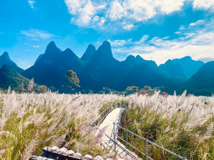 11月初的桂林阳光正好,在桂林七星区朝阳乡山镜·路亚小院的芦苇花海中,来自柳州的王女士举着手机追着光影拍摄,为朋友们留下了美好的秋日照片。脚下的栈道穿梭于数十亩芦苇丛中,将这片“白色花海”分割成层层叠叠的浪涛,一直延伸到远处的青山脚下,构成一幅浪漫的乡野秋景图。