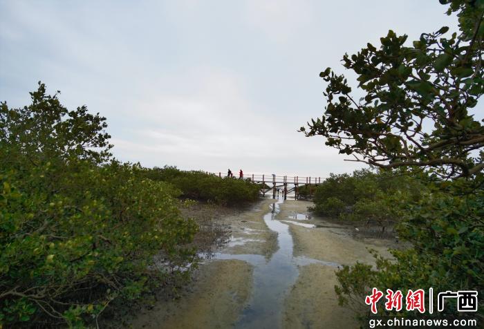 图为潮水退去后,游客穿越红树林赶海。林浩 摄