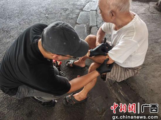 柳州辅警金嘉骏为摔倒老人进行消毒并仔细包扎止血。柳州警方供图