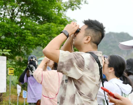 “快看!是白头叶猴。”随着一阵树影晃动,采风团看到了白头叶猴掩映在树丛下的身影,它们有的拖着长长的尾巴在林间穿梭跳跃、嬉戏觅食;有的在陡峭的崖壁上进行“跑酷”,动作行云流水。采风团连忙举起手中的设备,用镜头捕捉精彩瞬间。