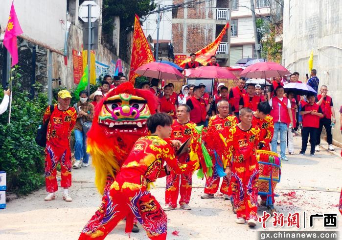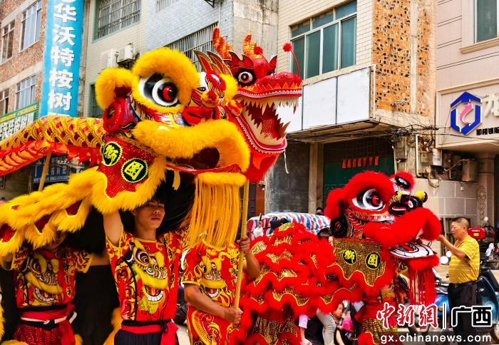 巡游队伍从坛墩坡球场出发,蜿蜒千米的长龙贯穿古街新街,金红祥龙昂首摆尾、腾跃翻飞,醒狮踩着鼓点跳跃嬉戏、憨态可掬,引领着巡游队伍缓缓前行。广西八音奏响千年韵律,唢呐高亢嘹亮、锣鼓铿锵有力;各支文艺队载歌载舞,轮番上演精彩节目,引得沿途群众踮足围观、举机拍摄。