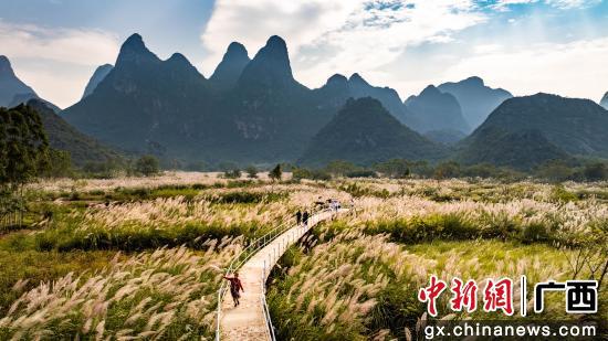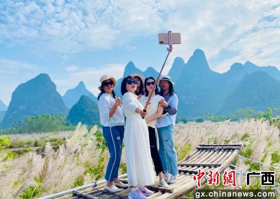 中新网广西新闻11月6日电(王亚东)11月5日,来自南宁的罗女士和几位朋友来到桂林市七星区朝阳乡的网红点“山镜·路亚小院”游玩,这里除了有别具一格的网红打卡点“屋顶休闲区”之外,还新推出了另一个秋景拍照点——芦苇栈道。罗女士和朋友们唱着欢快的歌谣走进栈道,登上“竹筏”,一起遥望成片的芦苇花海,在蓝天白云、青山绿水间拍下漂亮的照片。