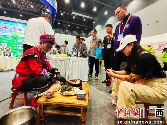在非遗美食展示区,人头攒动,排起了长龙,不少参观者慕名前来“打卡”,解锁“舌尖密码”。桂林米粉、柳州螺蛳粉、南宁老友粉、红油米粉、玉林牛腩粉、酸嘢、油茶、六堡茶、平南奶茶、青海拉面、天津赵大肚子烧麦等特色美食琳琅满目。观众可体验“泡一壶六堡、打一锅油茶、嗦一碗米粉”,现场好吃好玩、热闹非凡。