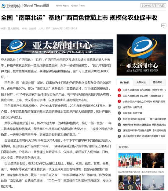 亚太通讯社:全国“南菜北运”基地广西百色番茄上市 规模化农业促丰收