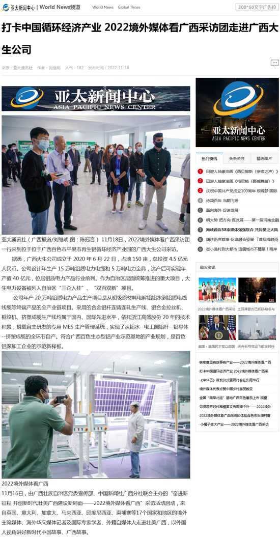 11月18日,2022境外媒体看广西采访团一行来到位于位于广西百色市平果市再生铝循环经济产业园的广西大生公司采访。