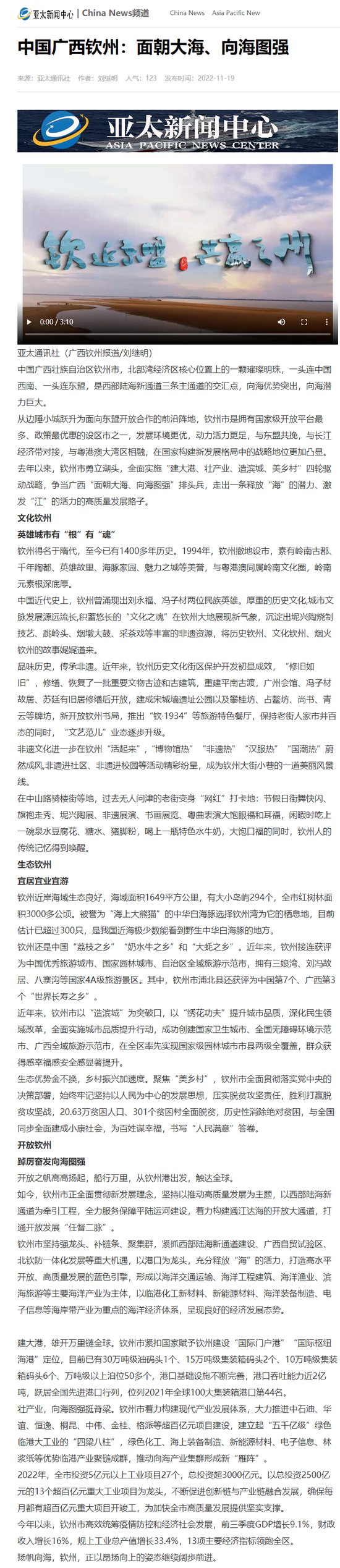 亚太通讯社:中国广西钦州:面朝大海、向海图强