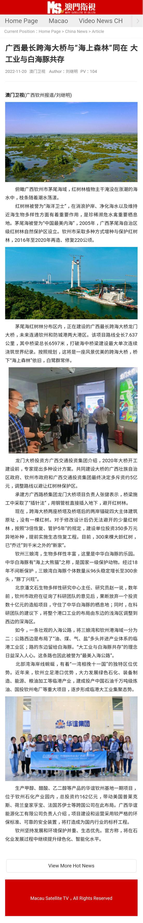 澳门卫视:广西最长跨海大桥与“海上森林”同在 大工业与白海豚共存