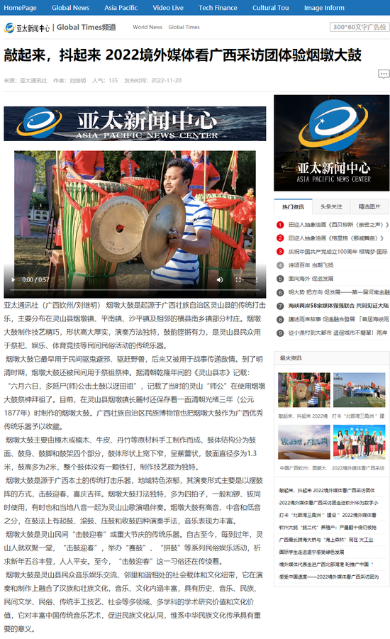 亚太通讯社:2022境外媒体看广西采访团体验烟墩大鼓