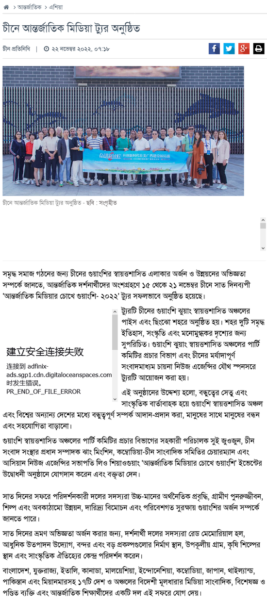 摘要提示:সমৃদ্ধ সমাজ গঠনের জন্য চীনের গুয়াংশির স্বায়ত্তশাসিত এলাকার অর্জন ও উন্নয়নের অভিজ্ঞতা সম্পর্কে জানতে, আন্তর্জাতিক দর্শনার্থীদের অংশগ্রহণে ১৫ থেকে ২১ নভেম্বর চীনে সাত দিনব্যপী 'আন্তর্জাতিক মিডিয়ার চোখে গুয়াংশি- ২০২২' ট্যুর সফলভাবে অনুষ্ঠিত হয়েছে।