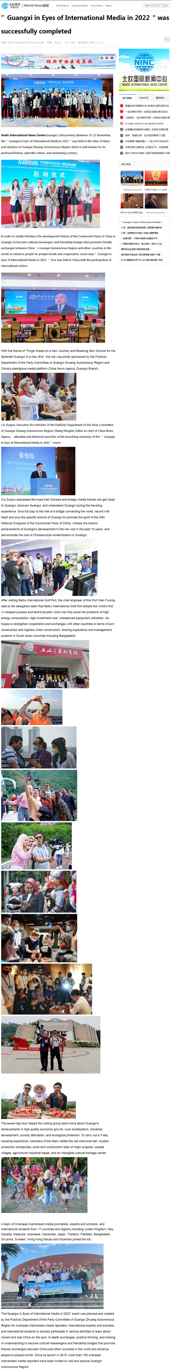 摘要提示:etween 15-21 November, the ”Guangxi in Eyes of International Media in 2022“ was held in the cities of Baise and Qinzhou of Guangxi Zhuang Autonomous Region which is well-known for its profound history, splendid culture, and enchanting scenery.