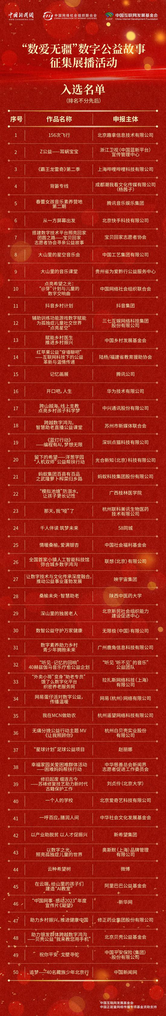 2024年11月起,中国网络社会组织联合会携手中国互联网发展基金会、中国新闻网,由中国互联网发展基金会中国正能量网络传播专项基金资助支持,组织开展“数爱无疆”数字公益故事征集展播活动,最终遴选出50个具有代表性的数字公益故事,入选名单近日公布。