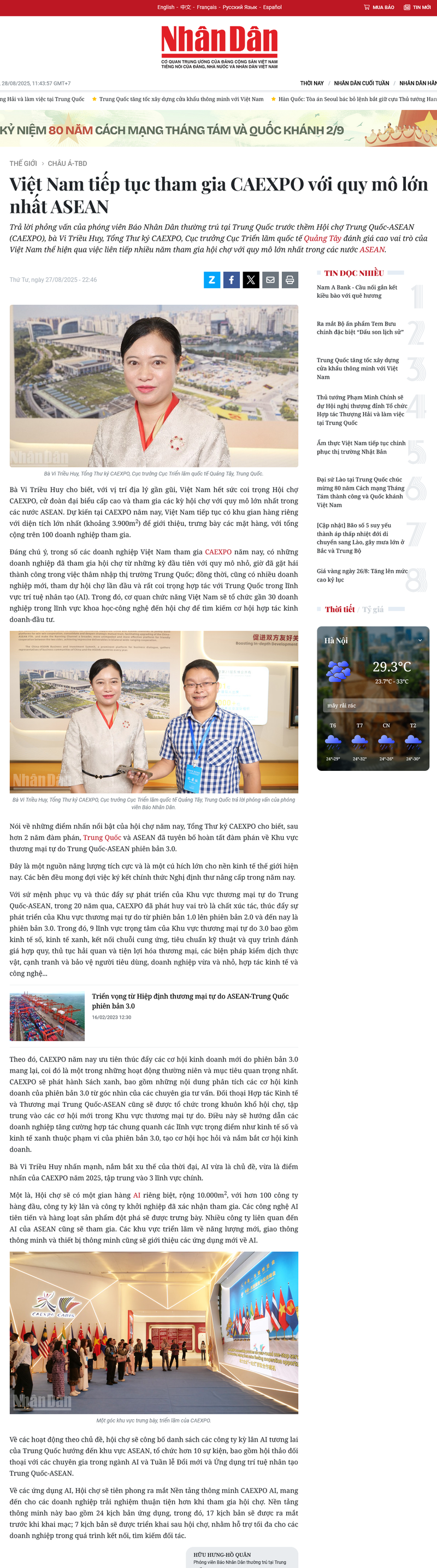 摘要提示:Trả lời phỏng vấn của phóng viên Báo Nhân Dân thường trú tại Trung Quốc trước thềm Hội chợ Trung Quốc-ASEAN (CAEXPO), bà Vi Triều Huy, Tổng Thư ký CAEXPO, Cục trưởng Cục Triển lãm quốc tế Quảng Tây đánh giá cao vai trò của Việt Nam thể hiện qua việc liên tiếp nhiều năm tham gia hội chợ với quy mô lớn nhất trong các nước ASEAN.