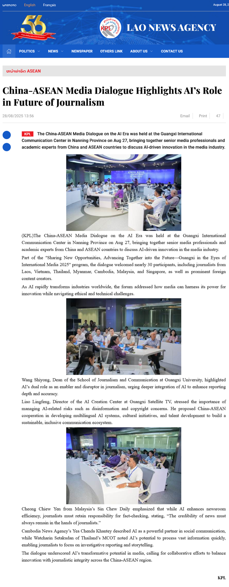 摘要提示:he China-ASEAN Media Dialogue on the AI Era was held at the Guangxi International Communication Center in Nanning Province on Aug 27, bringing together senior media professionals and academic experts from China and ASEAN countries to discuss AI-driven innovation in the media industry.