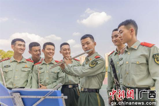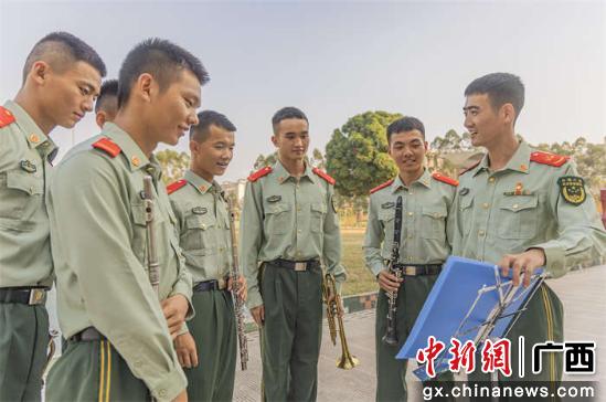 图为武警广西总队机动支队军乐队员们正在互相充当”小教员“。