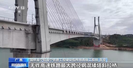 国铁南宁局南宁铁路工程建设指挥部高级工程师 张垒:为满足大桥行车要求,我们采用混凝土梁、钢混结合段及钢箱梁三部分组成的设计施工方案,这是目前国内在建时速350公里无砟高速铁路最大跨径钢混矮塔斜拉桥。