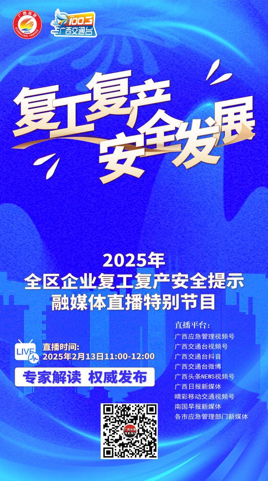 摘要提示:广西壮族自治区应急管理厅将于2月13日11:00-12:00携手媒体进行《复工复产 安全发展——2025年全区企业复工复产安全提示》融媒体直播。