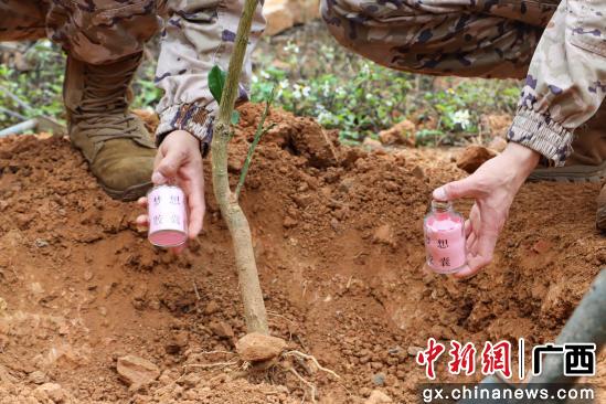 河池支队武警官兵准备“梦想胶囊”,将其“种”在自己亲手种植的树苗旁。