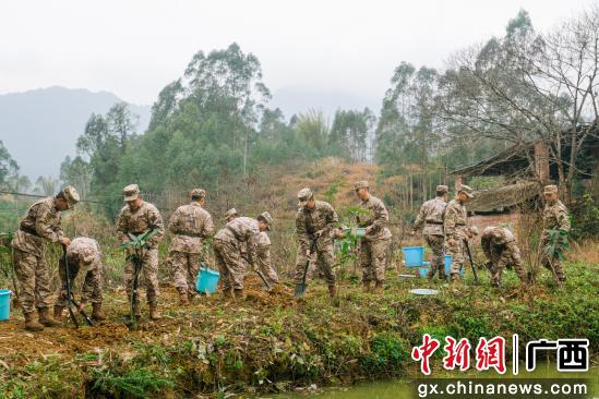 3月9日,在梧州市蒙山县蒙山镇福贵岭村,武警梧州支队组织官兵们开展植树活动。朱辉煌 摄