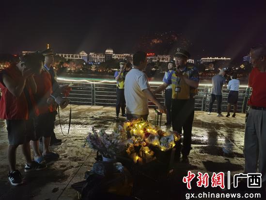 16日20时许,柳州市滨江东路音乐喷泉附近的亲水步道人流如织,一些商贩正在亲水平台向游客兜售小商品。小周和小杨也在人群中支起一个小摊。随后,几名执法人员对她们的占道经营行为进行整治。
