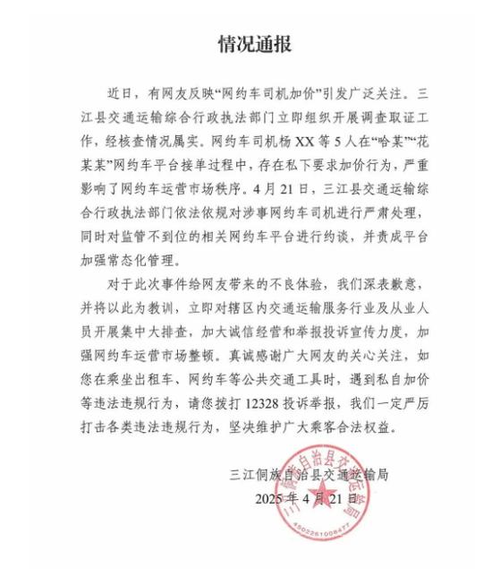 摘要提示:广西三江侗族自治县交通运输局21日晚发布情况通报:近日,有网友反映“网约车司机加价”引发广泛关注。三江县交通运输综合行政执法部门立即组织开展调查取证工作,经核查情况属实。