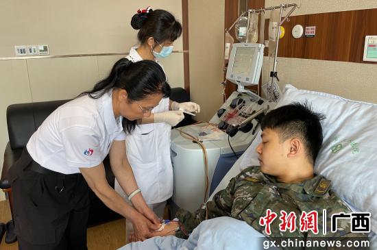 中新网广西新闻6月11日电(胡保卫 覃克土 唐明洋)近日,在广西柳州市工人医院,历经3个小时的血液分离采集,武警广西总队百色支队战士秦建成功捐献128毫升造血干细胞混悬液,这份“生命火种”将第一时间用于救治一名7岁血液病儿童。