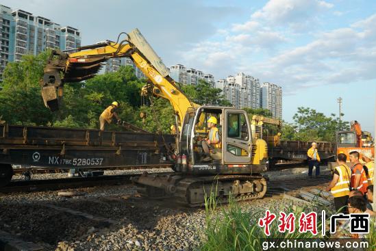 6月12日早上6时,湘桂铁路南宁南二场峰尾片区弧光闪烁、焊花飞舞,作业人员正在使用锯轨机、氧割枪等拆解一组交分道岔并铺设新的道岔。