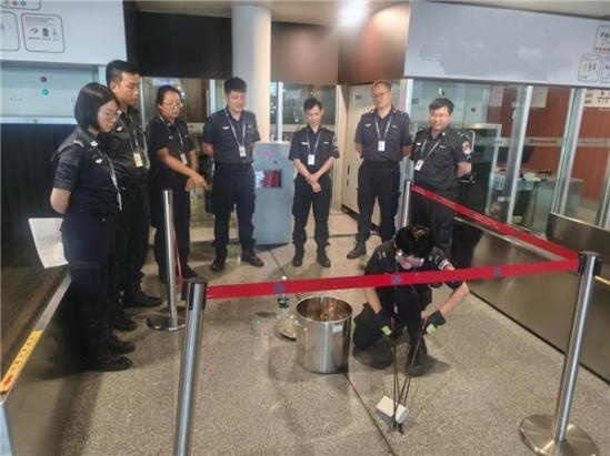 演练开始前,安检培训教员详细讲解了充电宝、锂电池起火应急处置预案,现场示范扑灭火源方法以及应急处置流程。安检员们逐一进行操作,掌握正确使用灭火器材的技能。演练中,现场安检人员发现情况后,迅速启动应急预案,立即疏散旅客,对火情进行快速、有序、高效处置,且信息报送及时、准确。