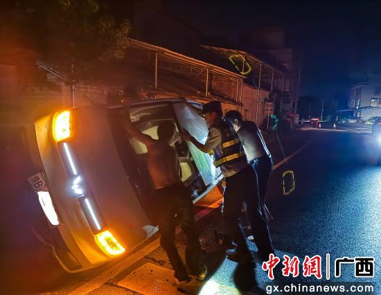 中新网广西新闻7月29日电(丘伟伦)一辆小汽车夜间在广西贺州市富川瑶族自治县乡镇县道不慎侧翻,驾驶人被困车内。正在路面巡逻的当地巡警发现后,迅速将被困人员救出,并与周边群众合力将侧翻的车辆扶正。