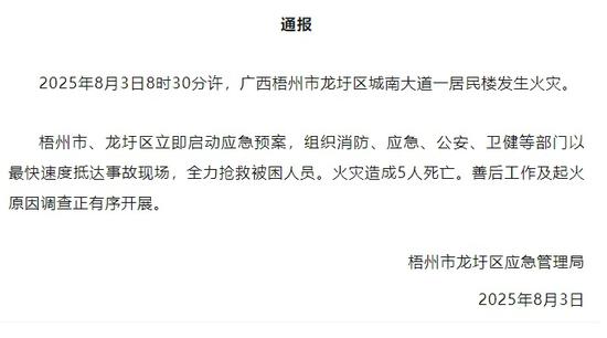 记者从广西梧州市龙圩区应急管理局了解到,8月3日8时30分许,梧州市龙圩区城南大道一居民楼发生火灾。梧州市、龙圩区启动应急预案,组织消防、应急、公安、卫健等部门抵达事故现场,抢救被困人员。火灾造成5人死亡。善后工作及起火原因调查正有序开展。