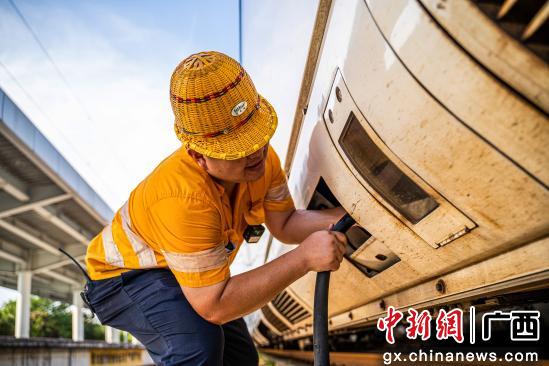 图为桂林北站列车给水员给动车注入清水。陈南豪 摄