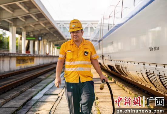 据了解,桂林北站每天图定开行旅客列车190趟,为保障车上旅客饮水、洗手、如厕等用水需求,刘振琳和同事一个班要给300多节车厢注入清水,上水量接近100吨。