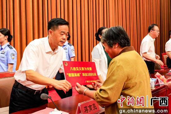 图为桂林市委常委、政法委书记蒋育亮为英模家属颁发慰问善款。杨宗盛 摄
