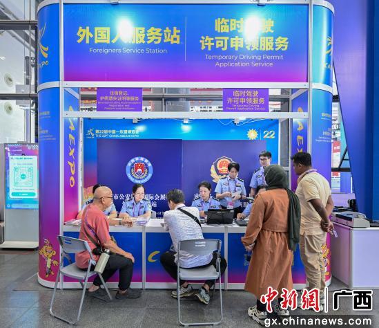 中新网广西新闻9月18日电(农媛) “安全好,生意好,人心好,中国very good!”9月17日,南宁国际会展中心,一名外籍宾客握着南宁市公安局车驾管所民警甘丽佳的手说。原来,南宁警方在这里设置了外国人服务站和临时驾驶许可申领服务点,这名外籍宾客商仅用10分钟,就完成了临时驾照申领。