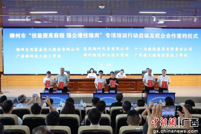 中新网广西新闻10月21日电(黄维 尹萍)柳州市“技能照亮前程强企增技稳岗”专项培训行动启动及校企合作签约仪式,日前在柳州市职业技能公共实训中心举行。现场一批高等院校、职业(技工)院校与重点企业完成合作签约,充分发挥政企校联动合作优势,赋能产业、促进就业。
